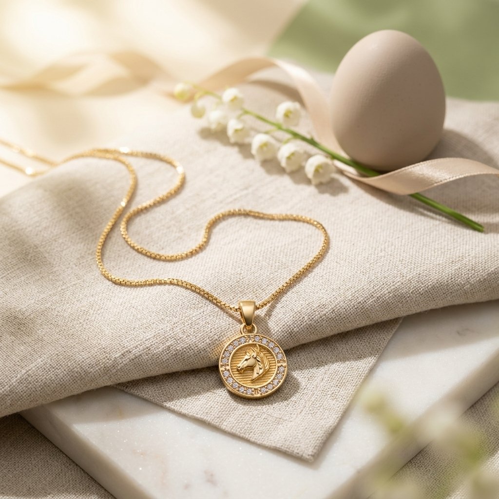 18k Gold Pleaded Equestrian Coin Necklace, A symbol of strength, freedom, and vintage prestige. This striking medallion necklace features a beautifully detailed, raised horse head profile set against a subtly textured horizontal backdrop. Encircling the equestrian center is a brilliant halo of pave-set cubic zirconia, adding a touch of modern glamour to the classic coin silhouette.