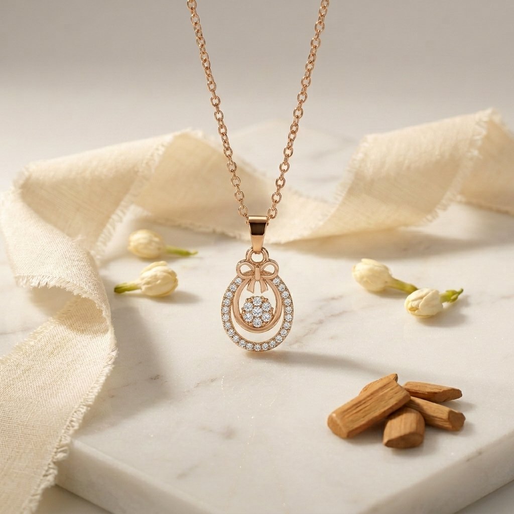 Meher – Rose Gold Bow & Floral Cluster Pendant. Feminine charm meets everyday luxury. The Meher features a beautifully polished ribbon bow resting atop a sparkling double oval frame, perfectly showcasing a delicate pave crystal blossom at its center. This intricate, vintage inspired design is bathed in a radiant rose gold tone, offering a soft, romantic elegance that catches the light with every movement.