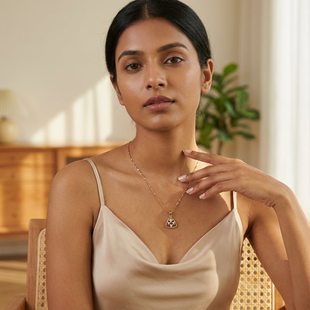 ✨ Styling Tip: The sharp, downward-pointing lines of this geometric pendant make it the ultimate piece to pair with a sharp V-neck blouse, a structured blazer, or a sleek satin slip dress.