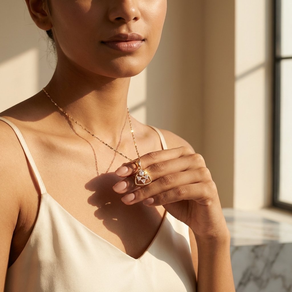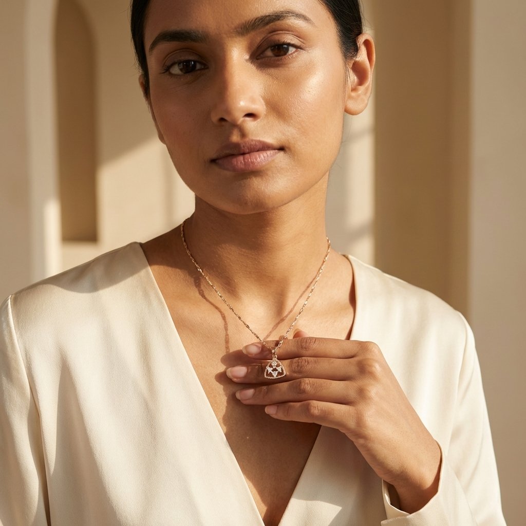 - The Design: A modern triangular shield pendant with a beaded border, enclosing a geometric cluster of round and trillion-cut cubic zirconia.